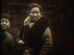 庭の掃き掃除をするおばあさん、犬や子どもたちもいる