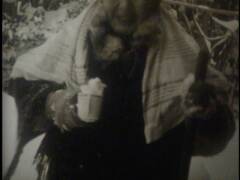 雪景色、降り積もった雪を漕いであるき、コップに雪をつめるおばあさん