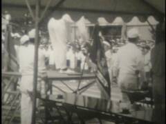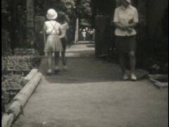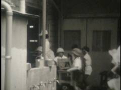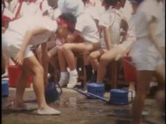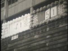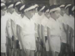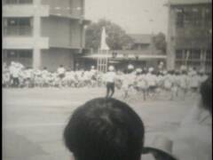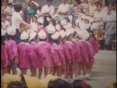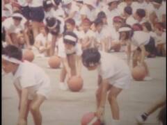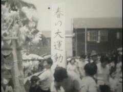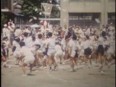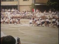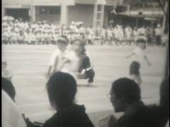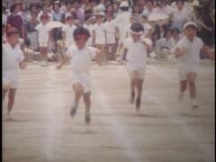 小学校の運動会。鉛筆で矢印を書き入れている競技に提供者が出場。撮影は提供者の父。木造校舎の校門前にお面と風車。売り物かどうかは不明。和服姿の高齢男性、カメラをもつ女性、犬を連れ歩く男性、敬老席。この頃は運動会用の足袋があった。校庭は砂ぼこりがひどかったと提供者は記憶している。
