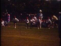 運動会。赤、緑、青の帽子が鳥帽子のような形に見えます。3才児は少しご機嫌ななめのよう。5才児はさすがにちゃんと整列し、まじめに競技しているように見えます。足下はズックのようですが、自分の時は地下足袋でイヤでした。 64才横浜市 詳細